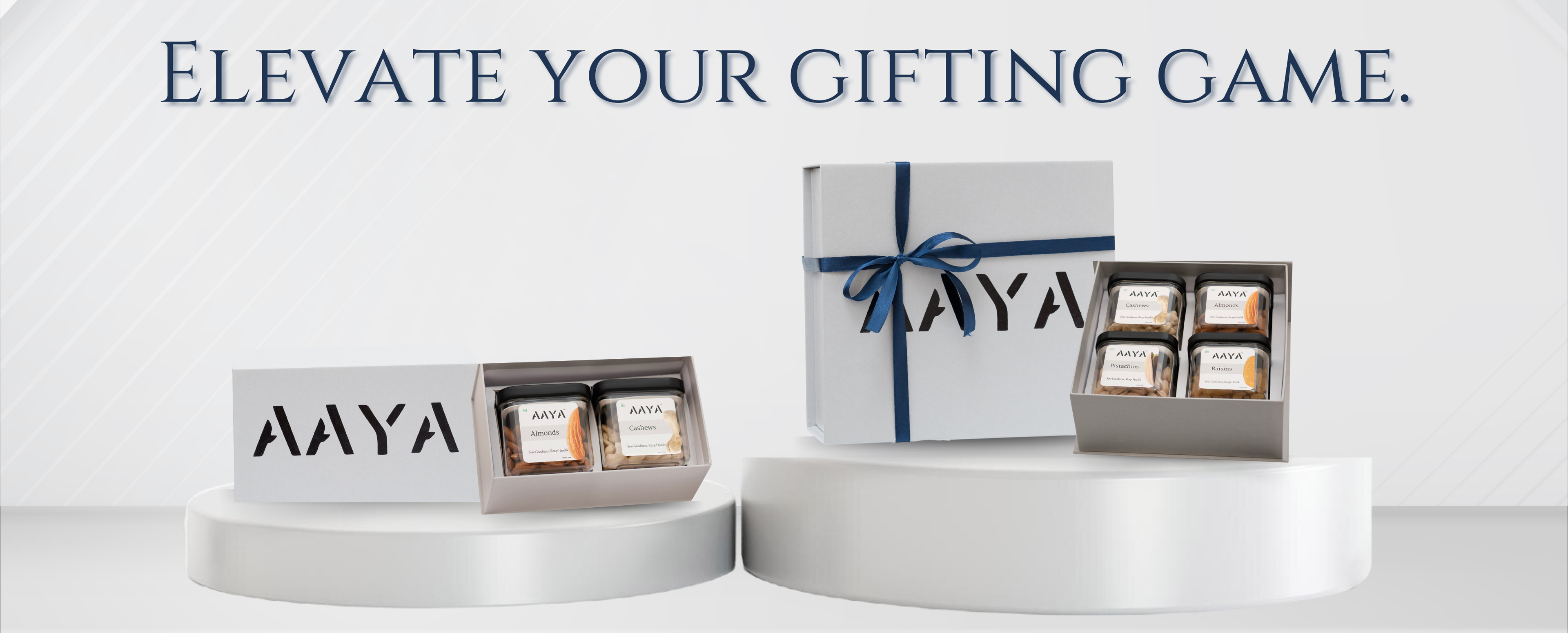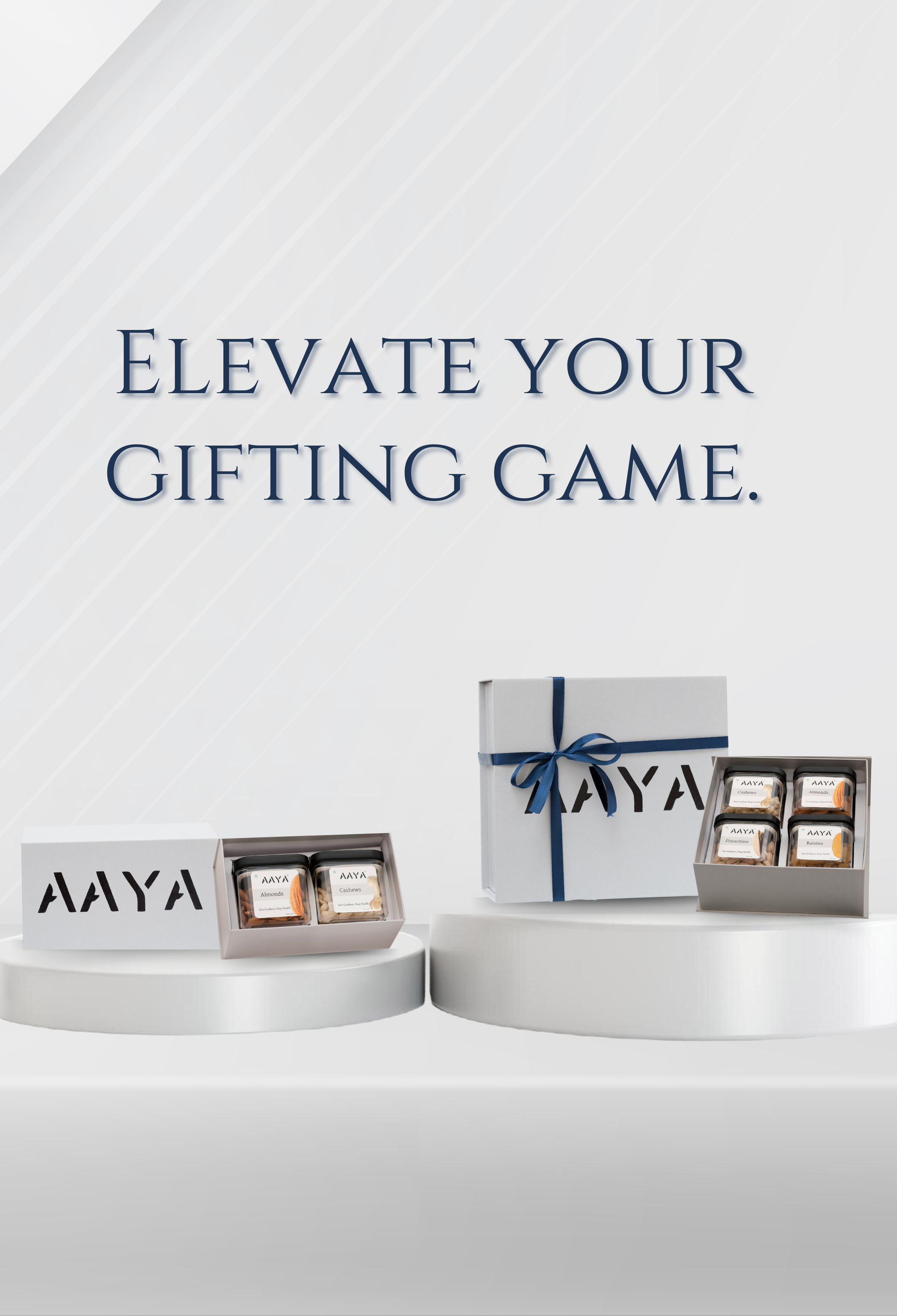 Elevate your gifting experience with AAYA curated range of premium gourmet gift sets. Perfect for any occasion, our beautifully packaged collections of nuts, seeds, and dry fruits offer a luxurious and health-conscious way to show you care. Each gift is thoughtfully designed to combine wellness with indulgence, making it a memorable present for your loved ones. Share the gift of health and taste with AAYA.