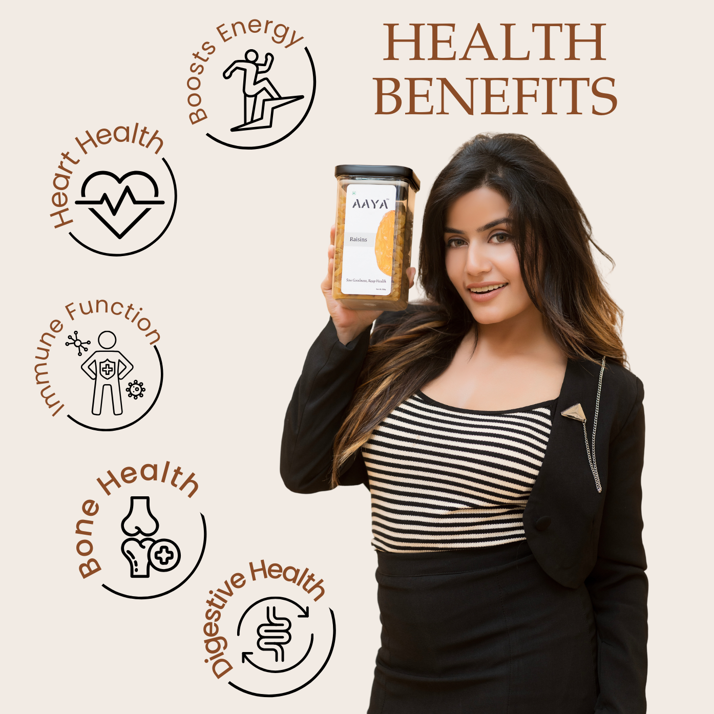 Raisins are sweet, dried grapes rich in fiber, vitamins, and antioxidants. They support digestive health, boost energy, and provide essential nutrients. Perfect as a snack, in baking, or as a topping for salads and cereals, raisins offer a naturally sweet, nutritious addition to your diet.